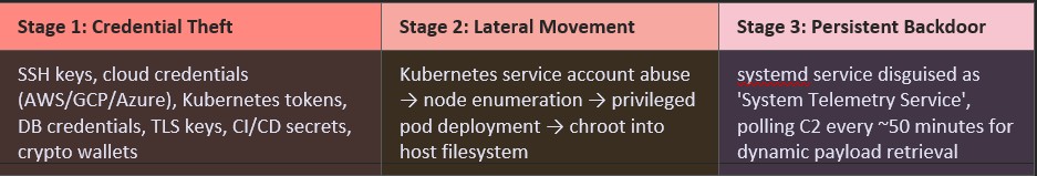 TeamPCP employed several techniques to evade detection and prolong persistence: